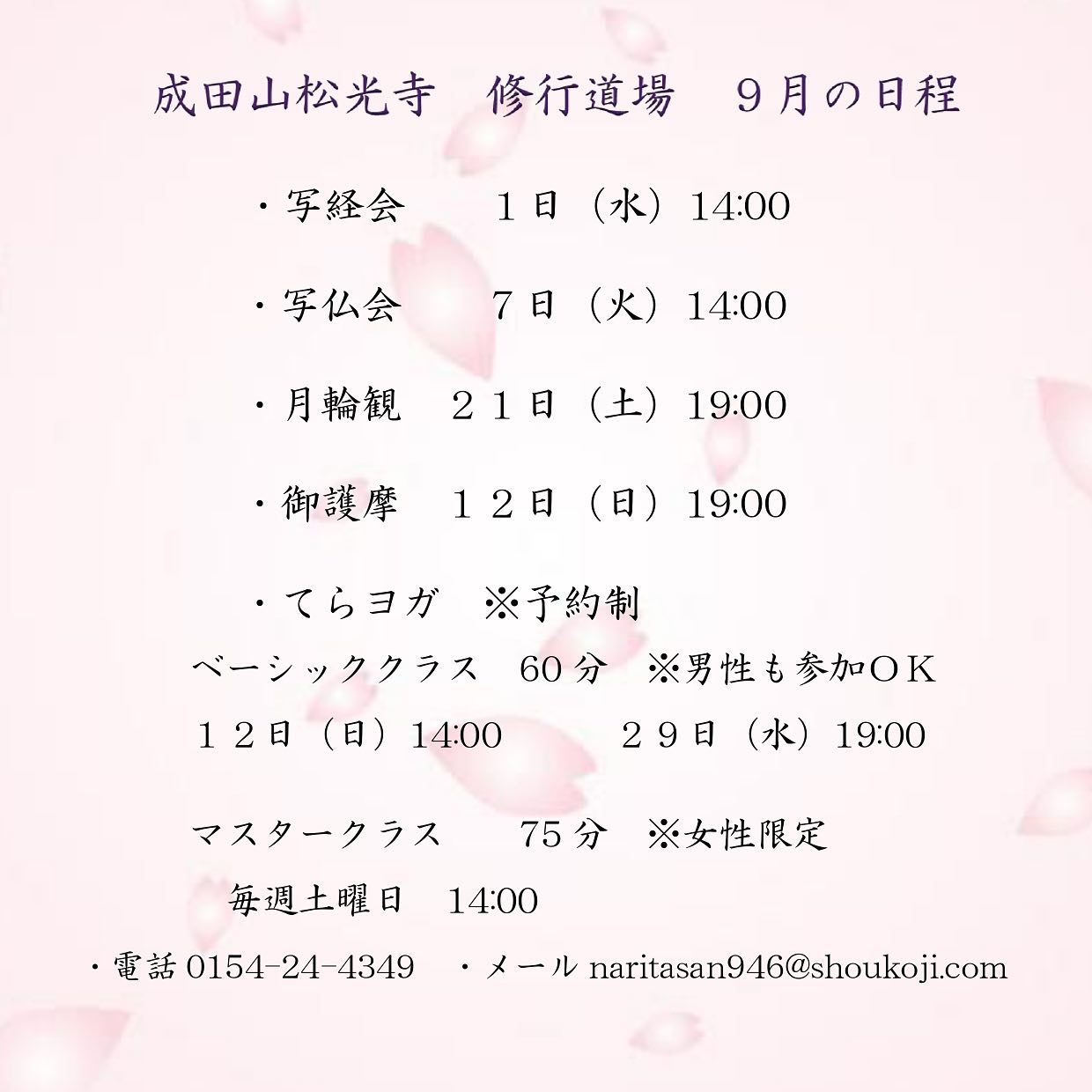 9月行事予定 2021年8月31日 成田山松光寺 9月の行事予定 写経会 1日(水)14:00 写仏会 7日(火)14:00 瞑想坐禅「月輪観」 21日(火)19:00 御護摩 12日(日)19:00 てらヨガ 12日(日)14:00 29日(水)19:00 どなたでもご参加いただけます。 換気・消毒・スペース等を留意して開催をしております。